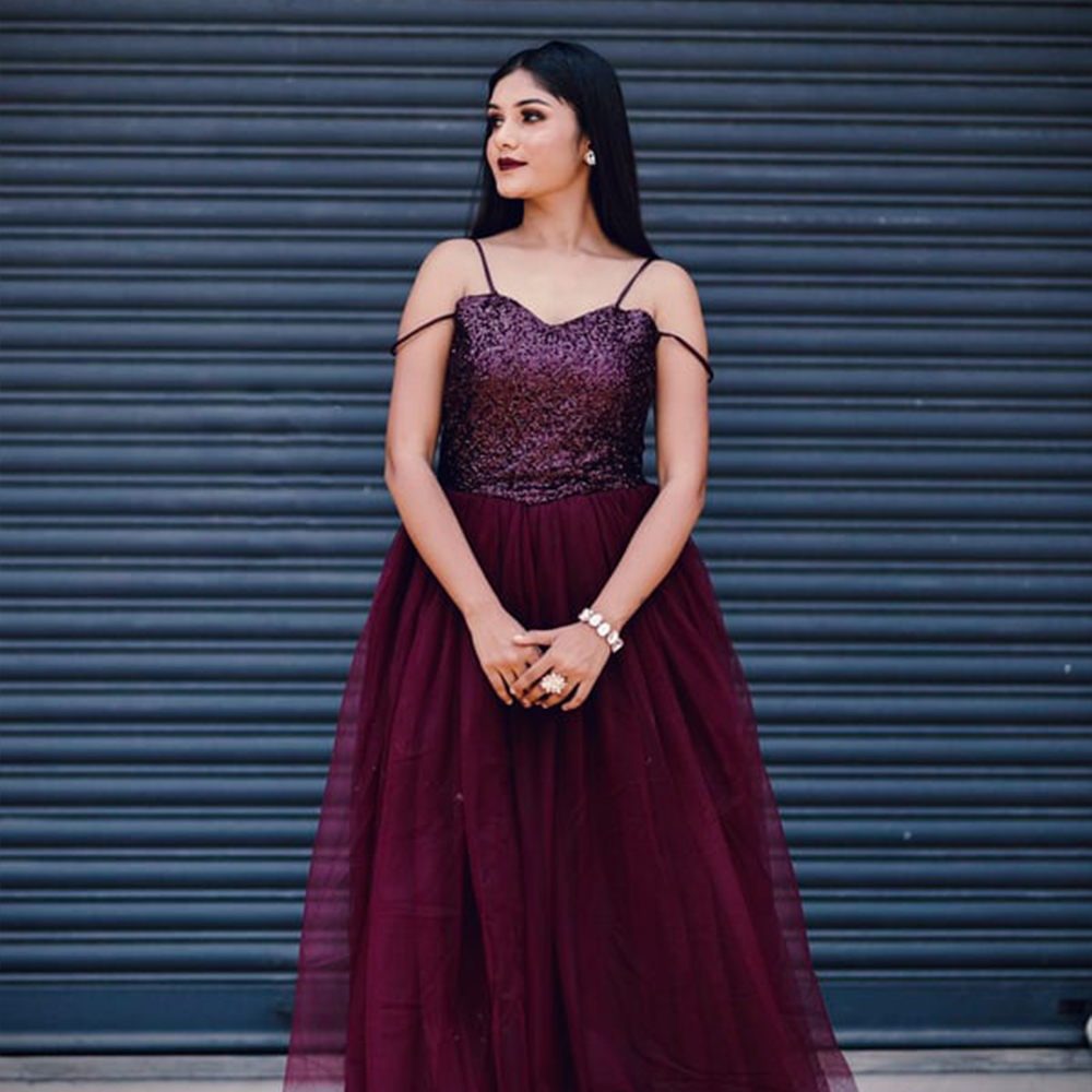 Be the first to review “Beautiful Sequins Work Wine Color Long Gown”